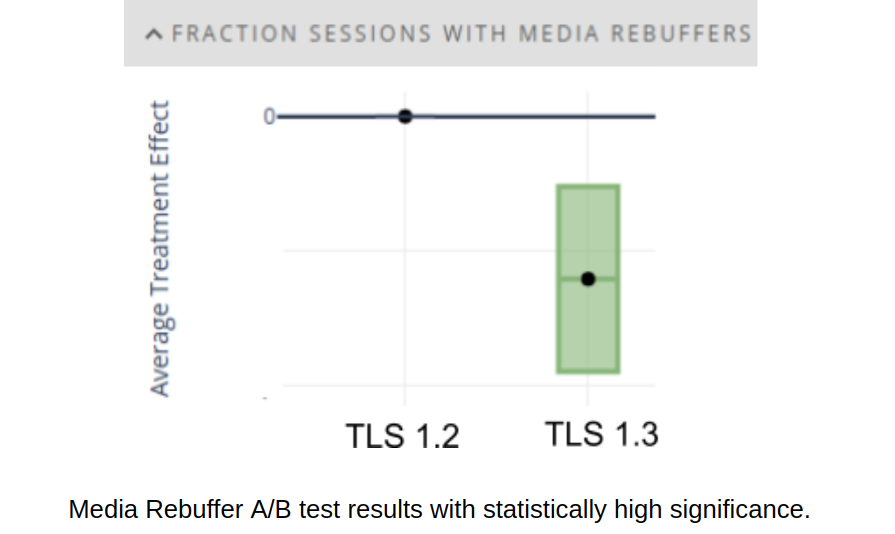 在 Netflix,我們將媒體重新緩衝定義為非網絡起源的重新緩衝。當由於CPU的高負載而導致設備未足夠快速地處理媒體數據時,通常會發生這種情況。與帶有 TLS 1.2 的控制單元進行比較,帶有 TLS 1.3 的實驗單元顯示了媒體重緩衝的大約 7.4% 的改善。此結果表明,將 TLS 1.3 與 0-RTT 結合使用會更有效,並且可以減少 CPU 負載。